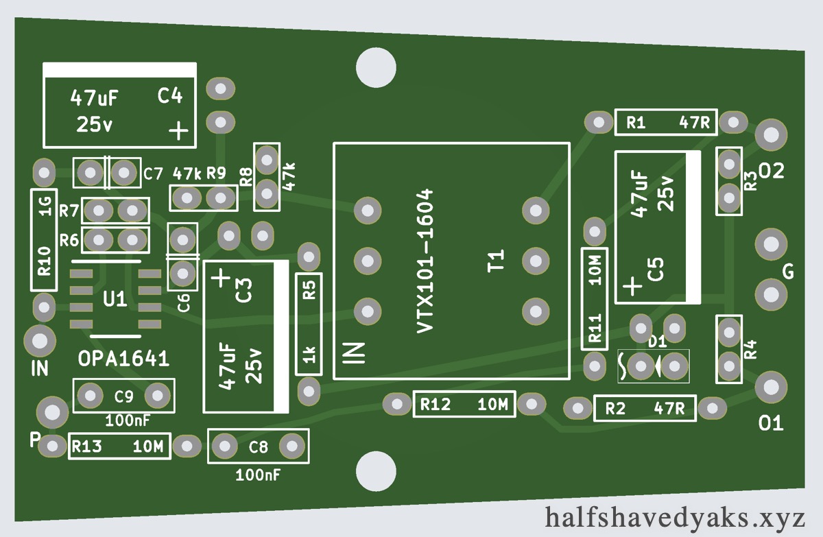 I have used an OPA1641 this is a very good sounding low noise modern opamp with relatively low current requirements (1.8ma). The board is made with SOIC8 solder pads - so you can use any SOIC8 single fet input opamp - but if you use one with higher current requirements you may need to lower the values of R3 and R4. You'll also want an opamp with very low noise.