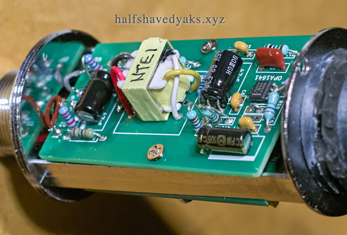 This board has an opamp-driven circuit on a board designed for cheap donor mics the BM700 and BM800.