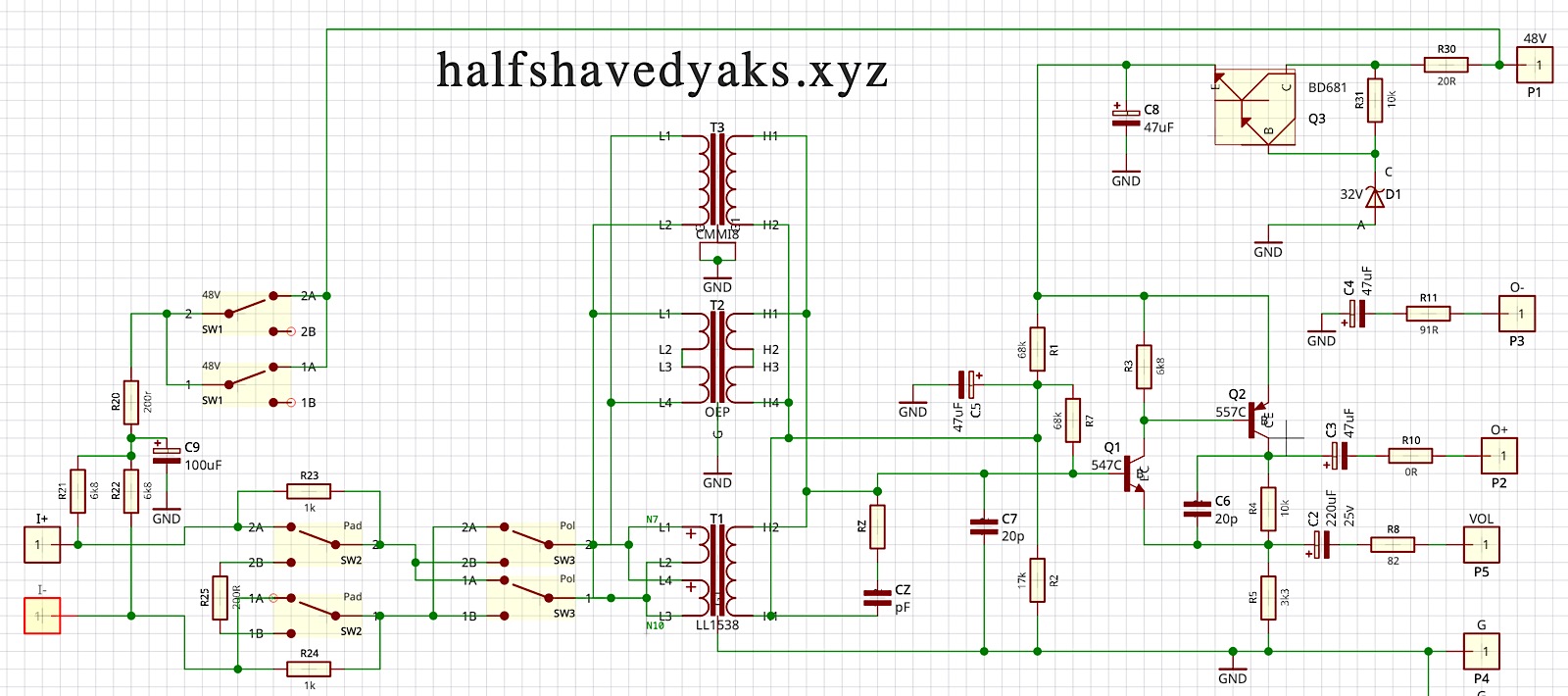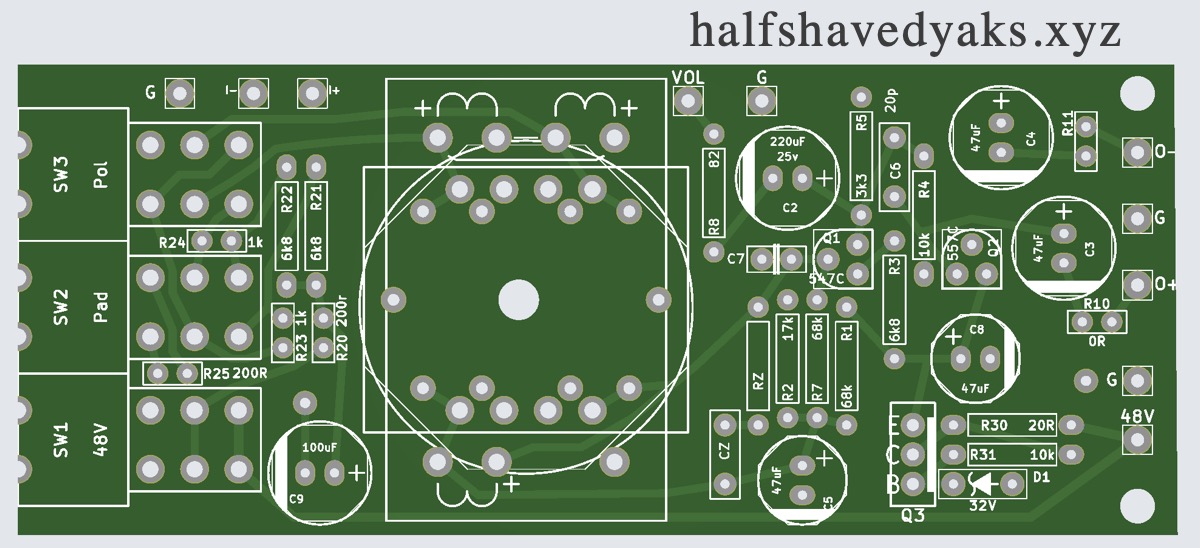 I have implemented the pcb with switches for pad, phase, and phantom power. I have also made pcb holes for Lundahl LL1538, OEP/vigortronix and cinemag transformers, and a mounting hole for transformers that bolt on through the board and connect with wires. You could of course use any suitable transformer and wire it in ad hoc.