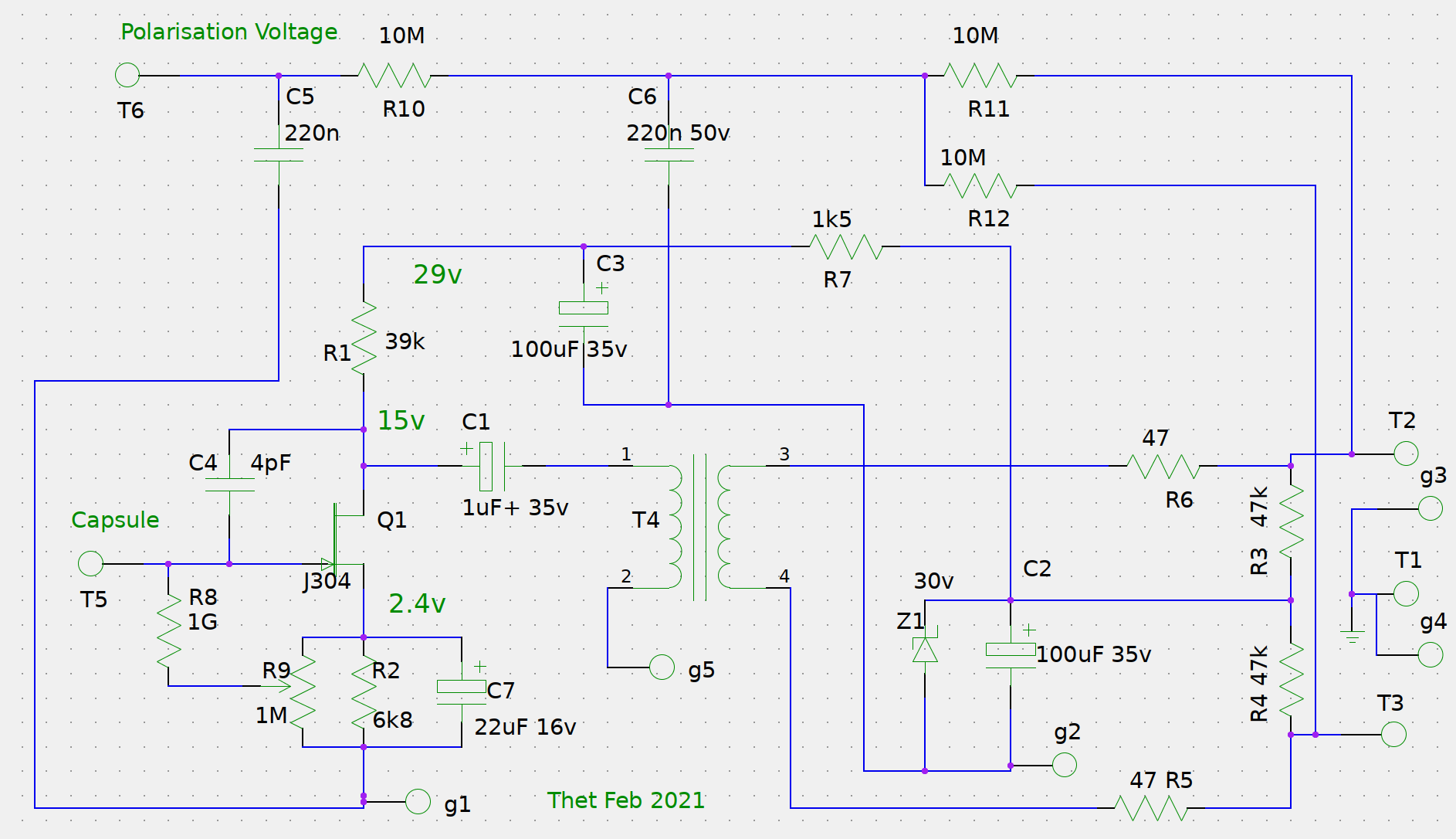 The polarisation voltage is derived from the phantom power with two filters using 10M resistors and 220nF capacitors. I use a ceramic C0G type for the first filter (C6) and a quality film cap for the final filter (C5), however I'm not sure that is necessary. Cap values are not critical but they must be at least 50v rating. If the caps are too large the polarisation voltage will take too long to get up to voltage.
