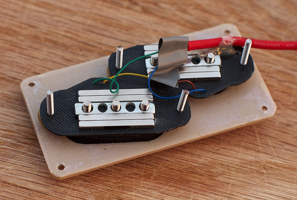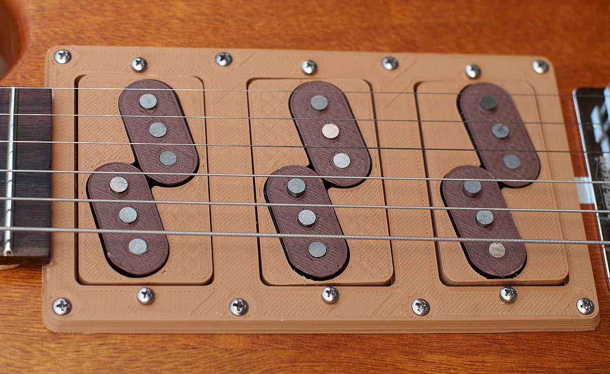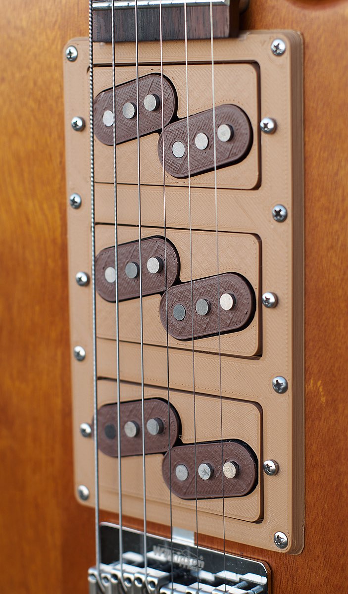 These can be made with Neodymium, Alnico or Ceramic magnets. The magnets pictured are neodymium, which gives a very direct, precise, almost agressive sound. Alnico magnets are not available in a suitable size, but I have had some modest success with breaking longer alnico bars in half and I'll try those next.